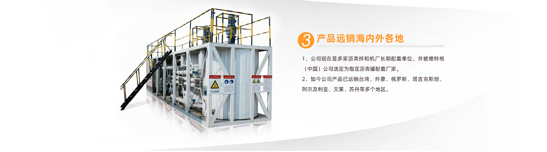 經多年的努力,在行業內已具有知名度及品牌影響力,獲得多家業內企業的認可,公司現在是多家瀝青拌和機廠長期配套單位,并被維特根(中國)公司選定為指定瀝青罐配套廠家。如今公司產品已遠銷臺灣、外蒙、俄羅斯、塔吉克斯坦、阿爾及利亞、文萊、蘇丹等多個地區。 ...... 【查看詳情】